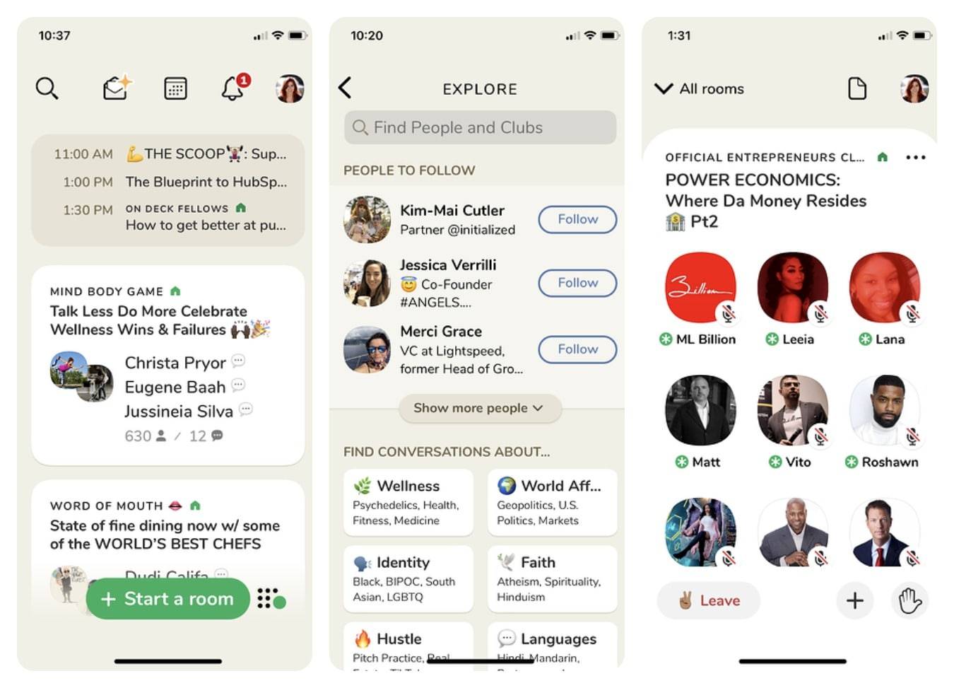 После открытия программы, человек может увидеть различные комнаты (аудиочаты). Здесь можно поговорить с другими людьми или просто послушать монологи на интересующие темы. Клиентам доступно создание собственных комнат, в которые можно пригласить друзей или посторонних личностей.