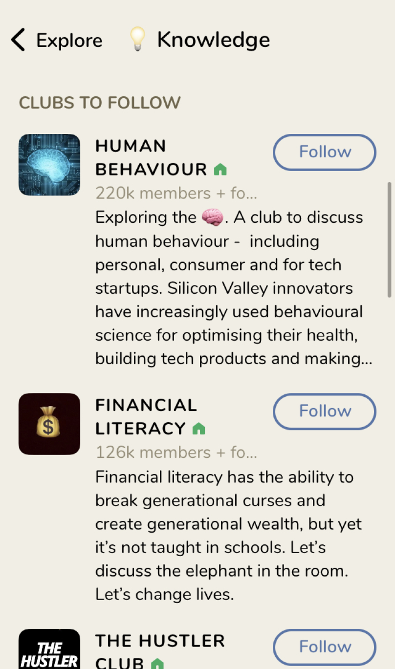 Вы можете создать собственный клуб. Для этого понадобится как минимум три раза организовать свою комнату, а затем представить «проект» клуба (о чем он будет и для кого) модераторам соцсети. Найти ваш клуб можно будет через обычный поиск внутри приложения, подборки клубов по определенным темам или подписки пользователей. На клуб можно подписаться — такая функция (заметьте, не «Вступить»!) позволяет создавать комнаты только членам сообщества. Клубы, на которые подписан и в которых состоит определенный пользователь, будут отражаться на его странице.