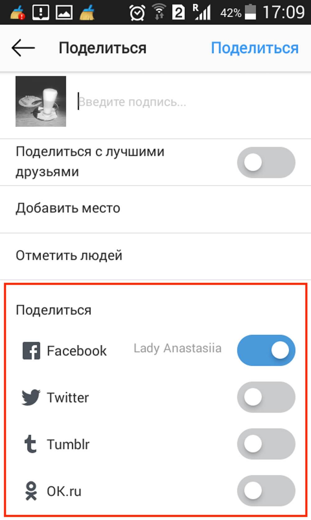 Например. Вы загрузили фотографию и написали к ней описание. Прежде чем нажать на кнопку “Поделиться”, включите кнопки нужных соцсетей.