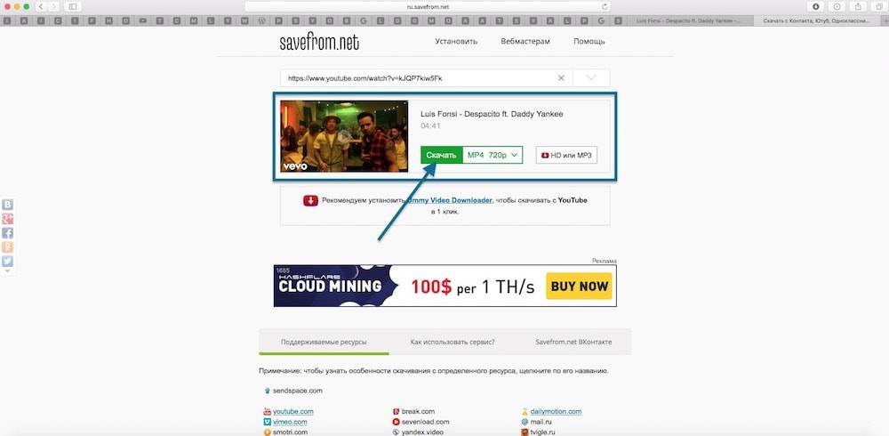 iGrab – это бесплатный онлайн сервис с русскоязычным интерфейсом, при помощи которого можно легко сохранить ролик как на смартфон, так и персональный компьютер. Доступен без регистрации.