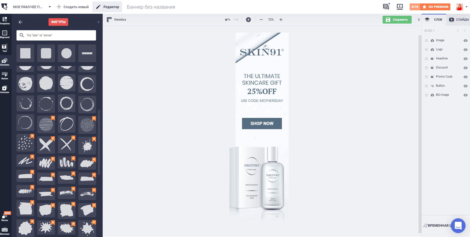 Bannerboo удобен тем, что есть слои, а значит, элементы можно прятать один за другим. Но в бесплатной версии возможностей немного. Подписка стоит 14.99 $ в месяц.