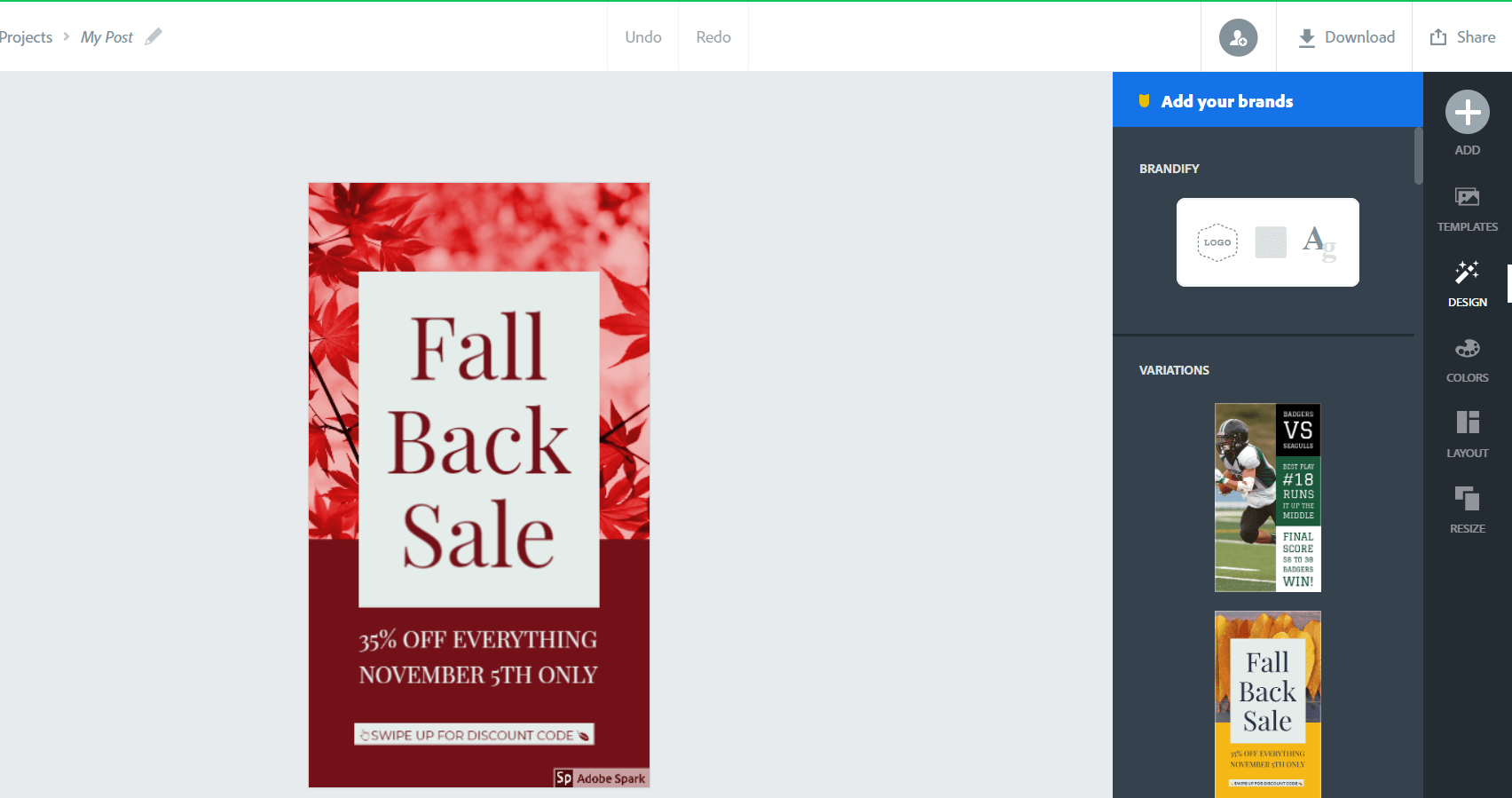 Этот сервис можно назвать «фотошопом для чайников». Adobe Spark – англоязычный, но интерфейс интуитивно понятный. Шаблонов много, но меньше, чем у Canva. Кроме языка неудобство создает правостороннее меню, но и к этому можно привыкнуть.