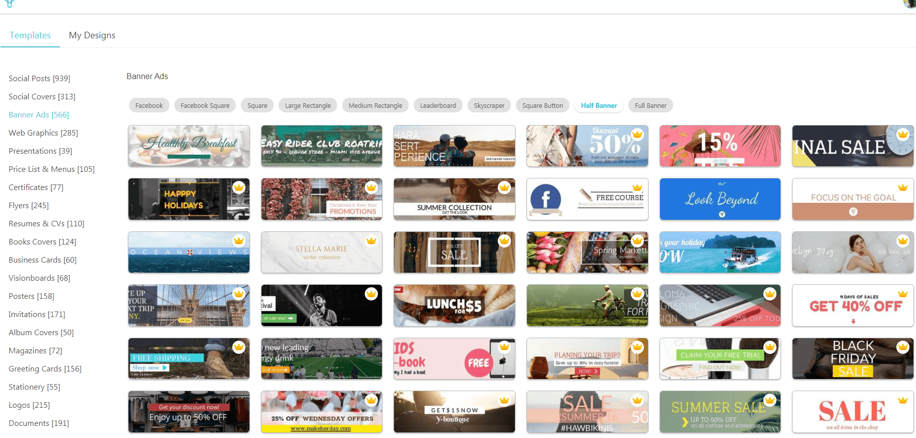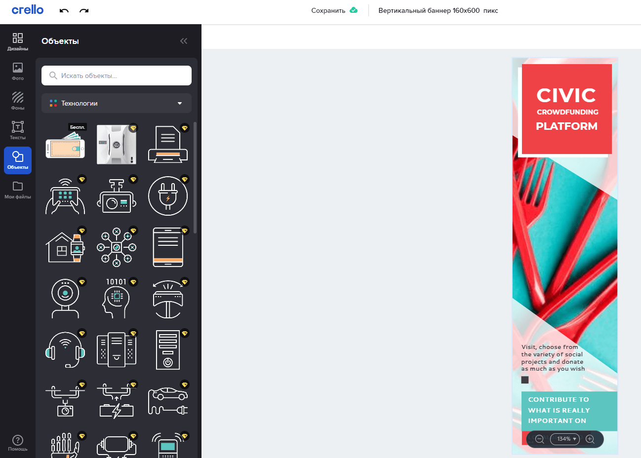 Сервис Crello удобен тем, что имеет популярные размеры шаблонов для рекламы в Google Ads. Дизайн, интерфейс и принцип работы практически такой же, как у Канва, только беднее. Но здесь можно найти интересные шаблоны и фоны, которых нет в других сервисах.