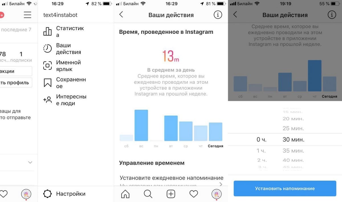 Разработчики ввели такую возможность. В том же пункте «Ваши действия», под диаграммой есть строка «Установить ежедневное напоминание». Это помогает задать лимит на пользование Инстаграмом.