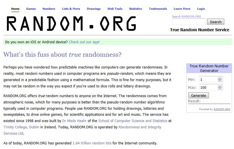 - Random.org – лучший способ выбрать победителя, если у вас есть доступ к нумерованному списку (например, электронная таблица с адресами электронной почты). На веб-сайте введите максимальное число (если у вас 125 участников, то 125) и нажмите, чтобы сгенерировать случайное число между 1 и 125. Затем вернитесь в свой список/электронную таблицу – полученный номер записи является вашим победителем. Также можно воспользоваться списком Randomizer, вставив в свой список. Если используется эта функция, перечень (имя/адрес электронной почты/запись в качестве победителя) будет отображаться в случайном порядке.