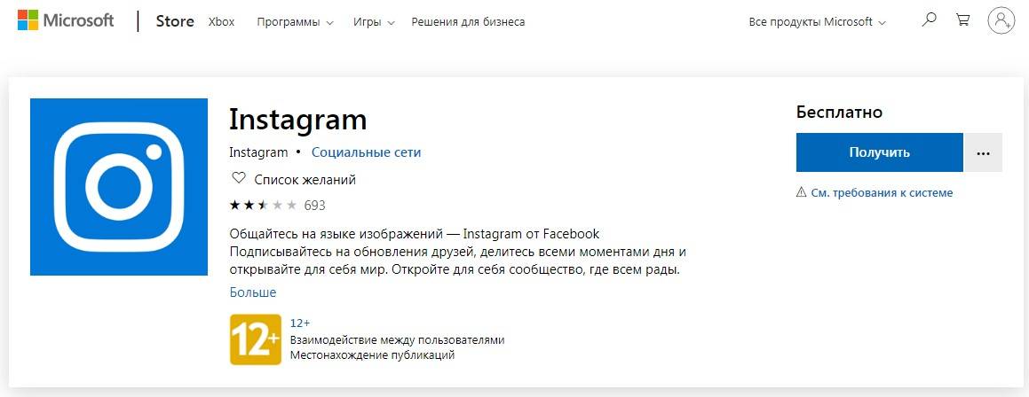 2. Найдите приложение для Instagram, а затем нажмите на клавишу «Получить» либо «Установить».