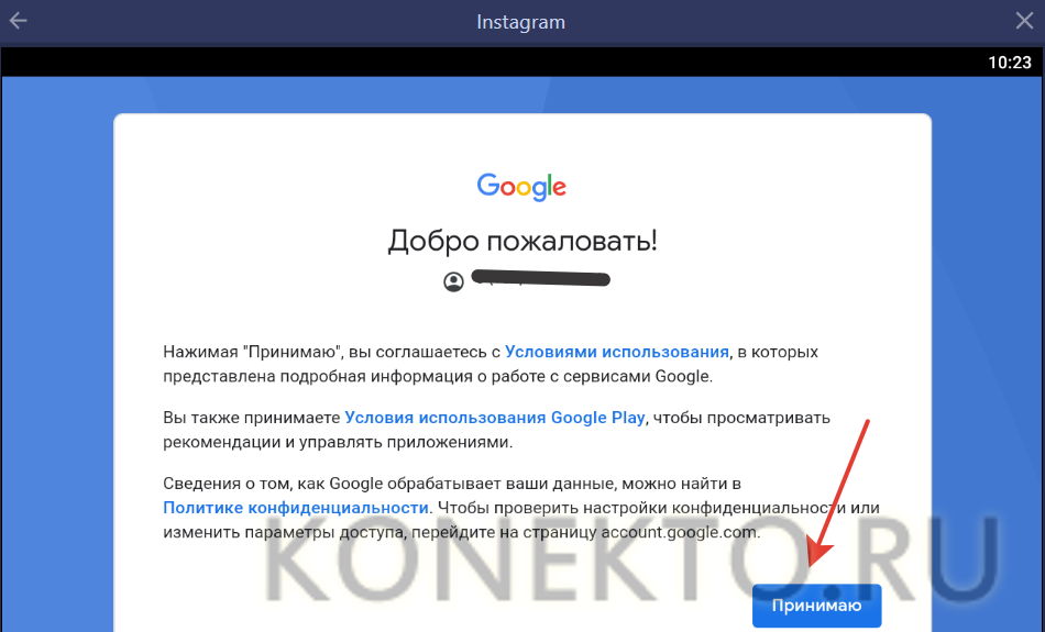 - Войдите в свой аккаунт Google. Нажмите «Продолжить», затем войдите в систему, используя свою учетную запись Google. Ознакомьтесь с условиями обслуживания и, если вы согласны, нажмите «ОК». Следующие флажки не являются обязательными; если вы используете только BlueStacks для загрузки в Instagram, не стесняйтесь снимать их все. Нажмите стрелку «Далее», затем введите свое имя (оно будет использоваться только для персонализации некоторых приложений).