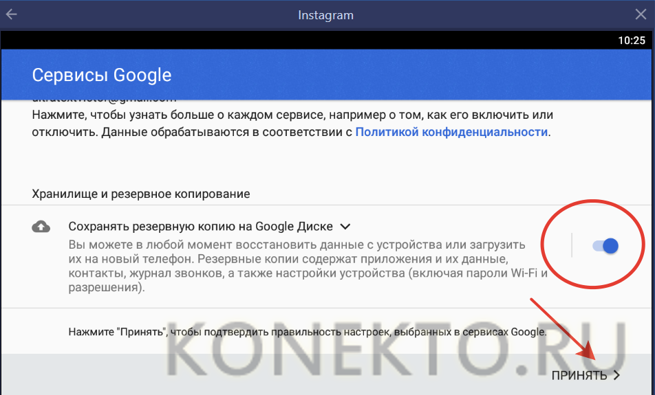 При необходимости отключаем или включаем сохранение резервной копии на Google.Диске и нажимаем «Принять».