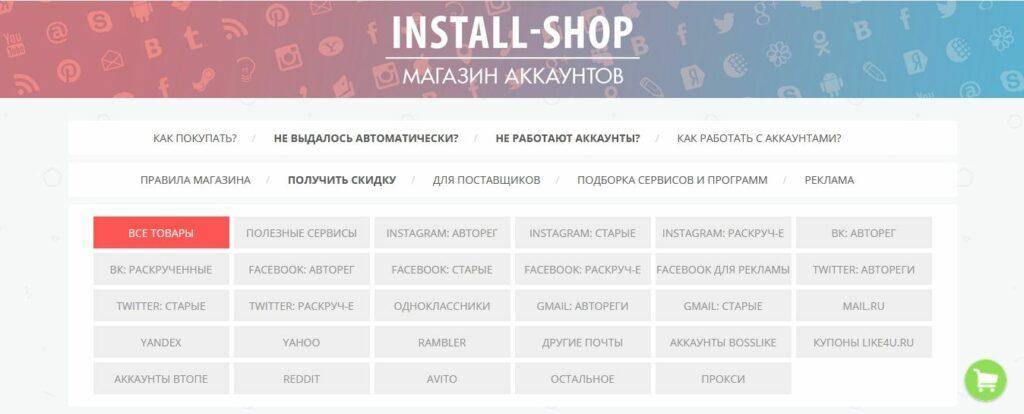 Магазин с высоким рейтингом, предлагающий большой выбор готовых профилей в соц сетях и на почтовых сервисах. Здесь можно купить аккаунт инстаграм с живыми подписчиками, либо раскрученный при помощи ботов и сервисов массфоловинга и масслайкинга. Вся информация о типе страницы, методах продвижения и дате создания содержится в каждом объявлении.