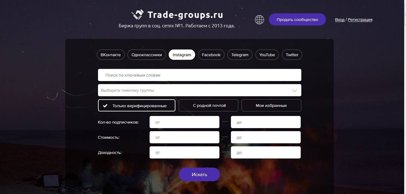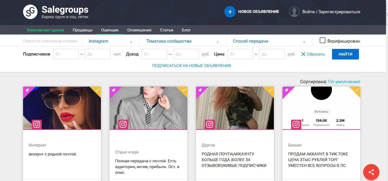 Salegroups.ru. Биржа надёжно защищена от мошенников, поскольку предполагает прозрачные этапы оплаты и передачи аккаунтов Instagram. Сайт начал работать в 2015 году, отличается приемлемыми ценами на приобретение профилей и удобной системой навигации.