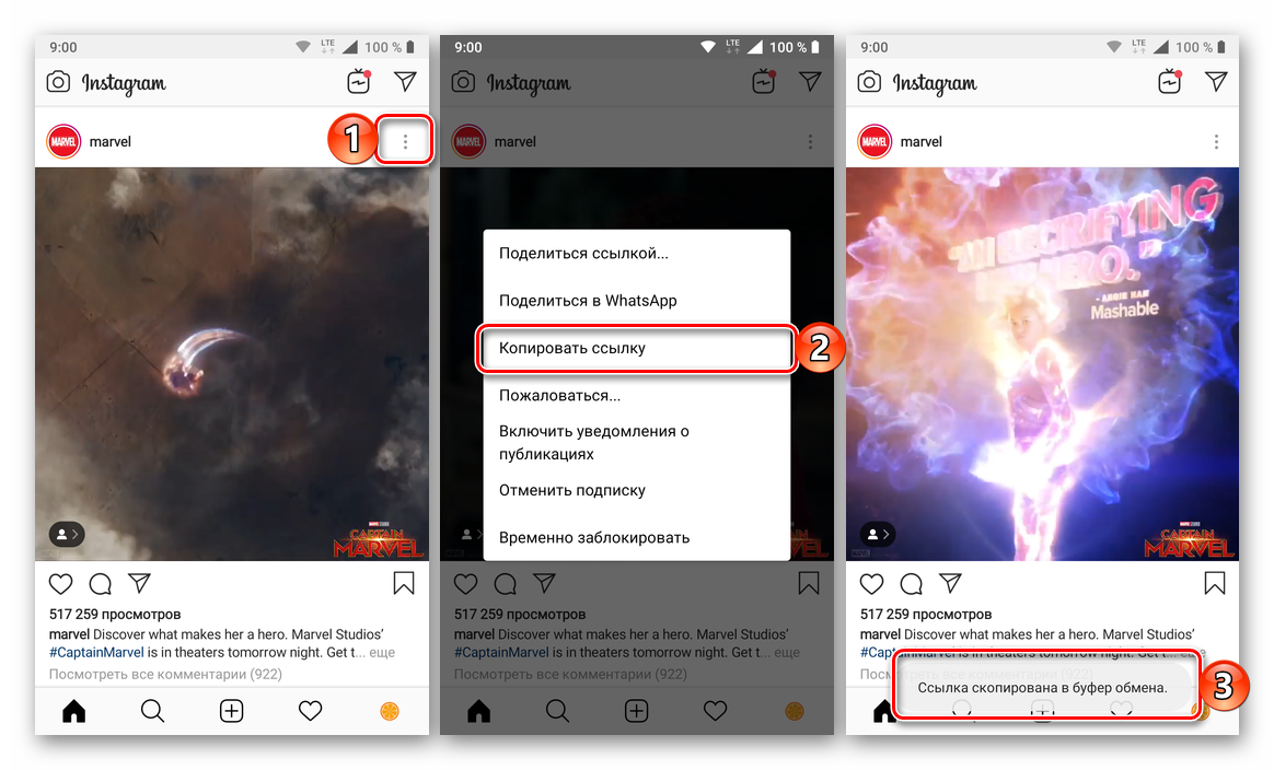 Появится системный отчет о том, что ссылка была скопирована в буфер обмена. Свернуть Инстаграм.