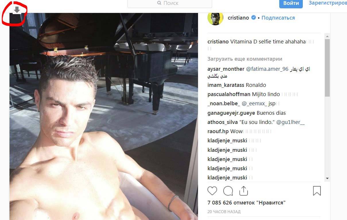 ● Выбираю фото, которое я хочу сохранить. Например, мне понравилась фотка Криштиано Роналдо, у которого, кстати 155 миллионов подписчиков. Представляете? Даже на Ютубе, который появился намного ранее, ни у кого столько нет. Захожу на его официальный аккаунт и выбираю изображение: