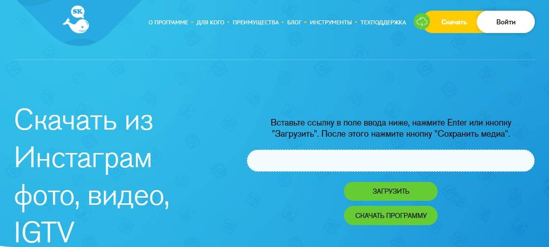 Максимально простой в работе онлайн-сервис, позволяющий выгружать из Инстаграма любой медиа-контент. Просто вставьте ссылку на нужный пост в строку на сервисе и кликните по кнопке снизу “Скачать”. Работа с сервисом возможна как через ПК, так и через мобильные устройства.