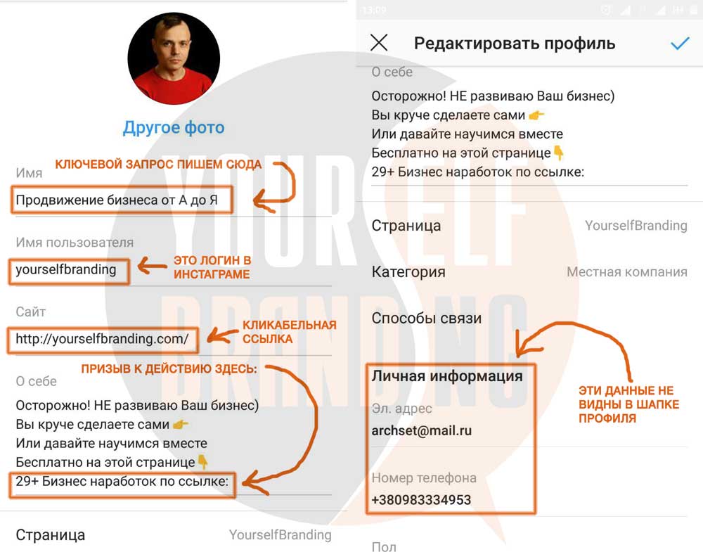 Впишите все возможные контакты в шапку Инстаграма. Писать их нужно в настройках профиля в поле О себе. Поскольку здесь есть ограничение на количество вводимых знаков, можно указать единый номер телефона на котором будут доступны все мессенджеры и предоставить эту информацию.
