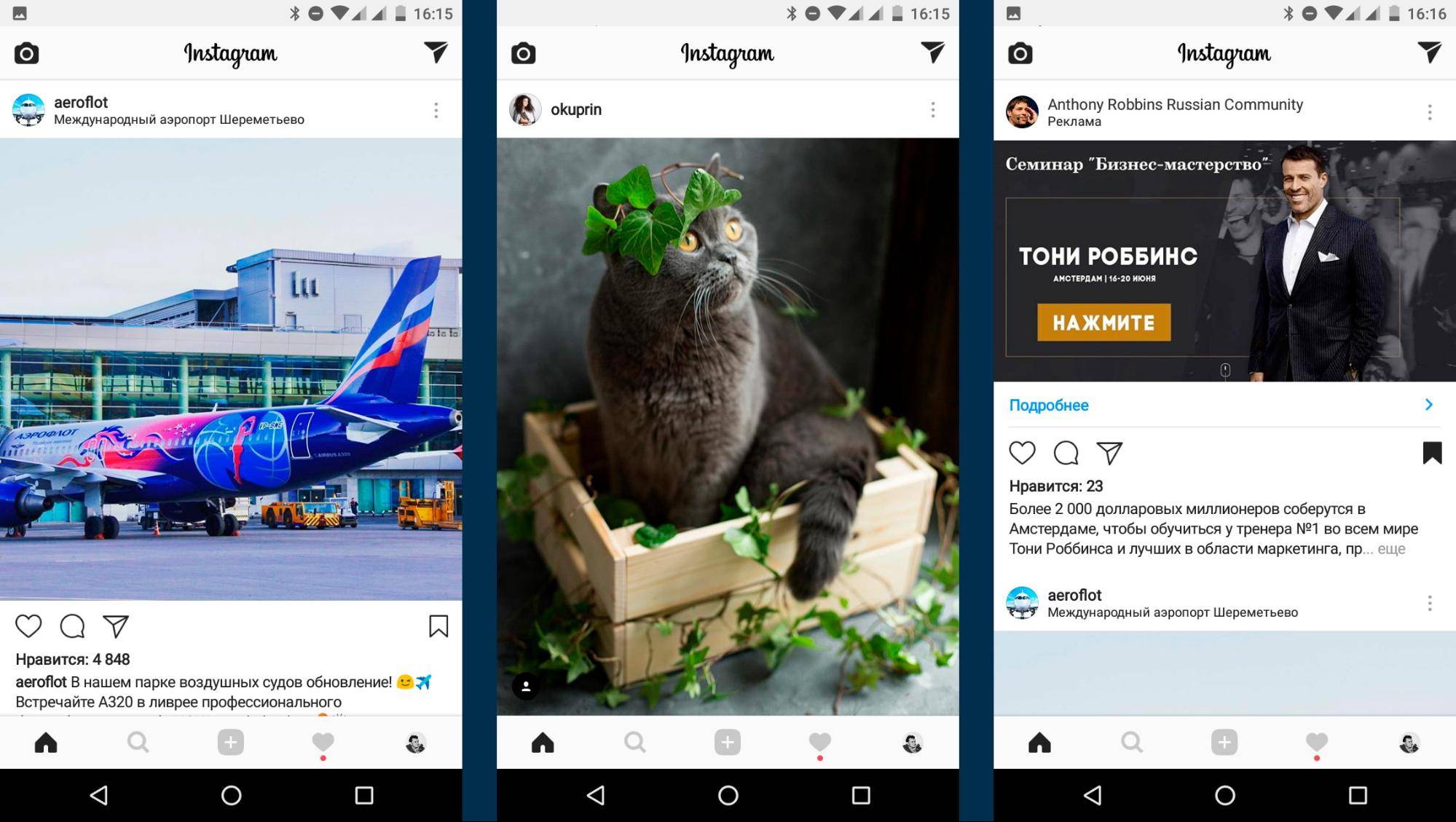 Время квадратных публикаций давно ушло. Теперь Инстаграм кушает прямоугольные и квадратные кадры. Есть три варианта кадров: