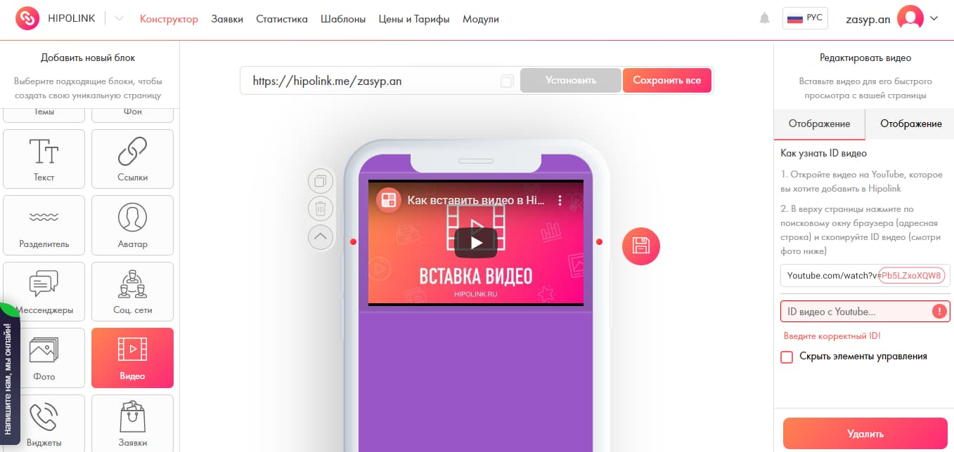 Блок «Видео» — укажите ссылку на видео с Ютюб;