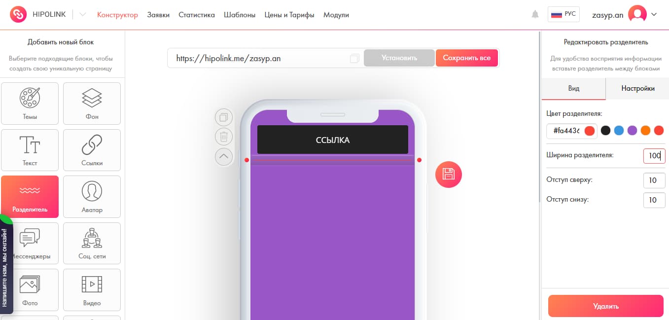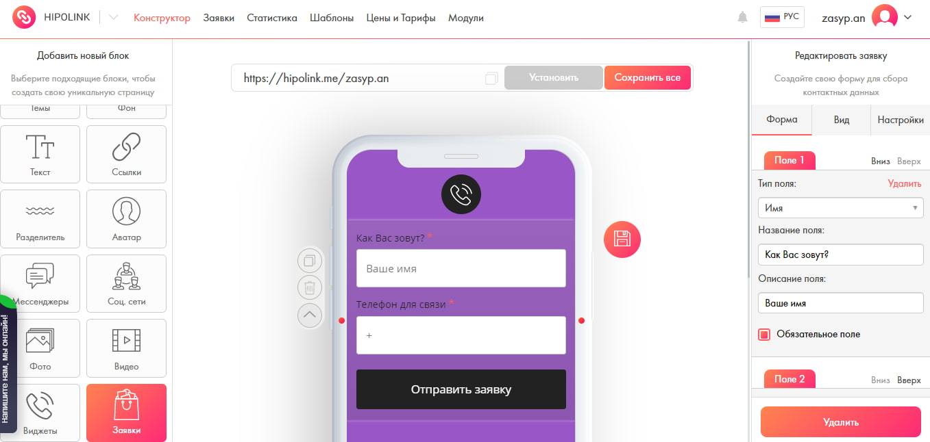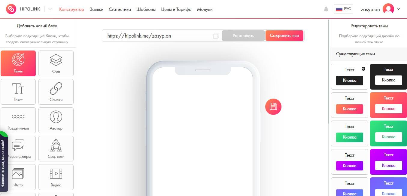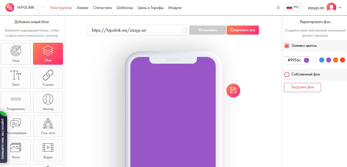Hipolink. Удобный сервис, в котором можно за пару минут сделать мини-лендинг. Работает по принципу «Перетяни и поменяй», то есть всё делается мышкой и без программистов. Очень удобный и понятный интерфейс, есть бесплатная версия, а платная — очень недорогая. Из дополнительньх опций: можно настроить уведомления в Телеграм, подключить пиксели ретаргетинга Facebook и VK, есть более 100 протестированных шаблонов.