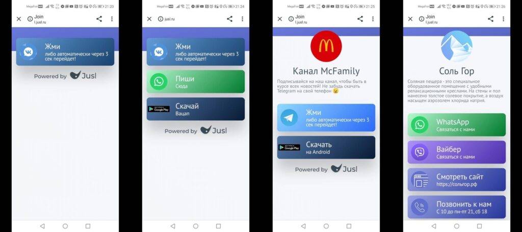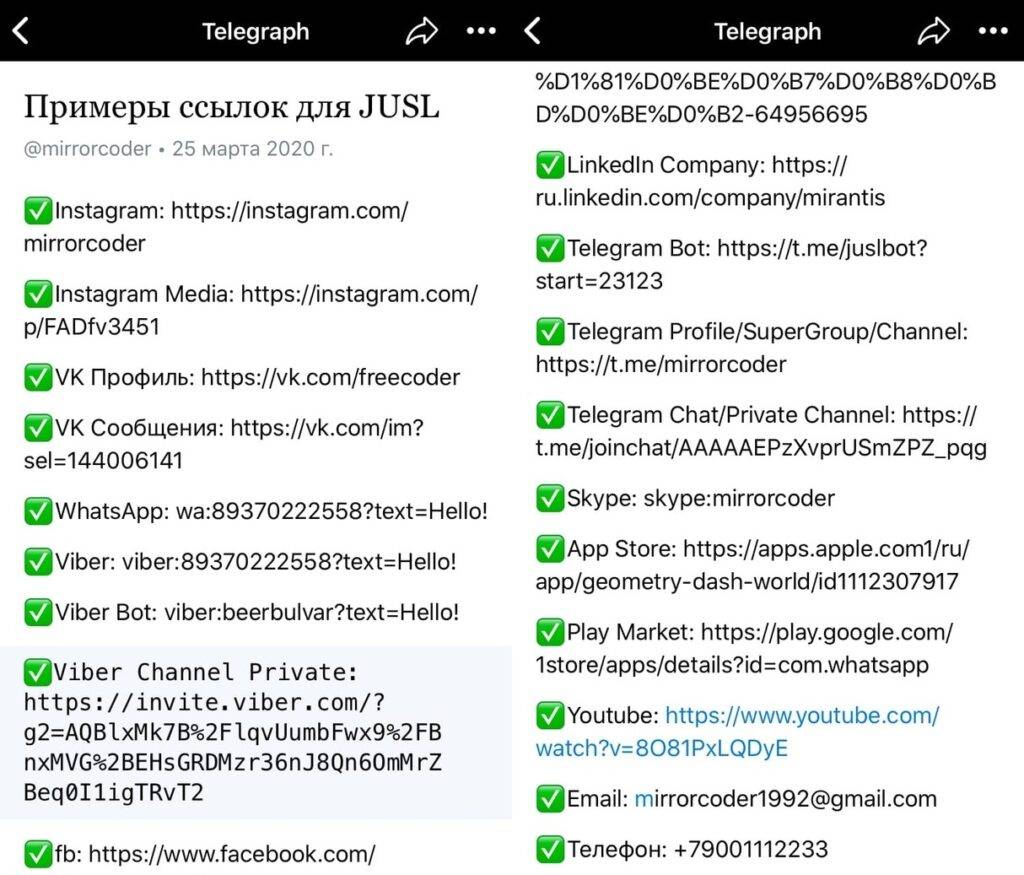 Все, что для этого нужно – авторизоваться по номеру телефона и указать ссылки. Формат ссылок для Jusl указан в примере. Это могут быть любые мессенджеры и социальные сети.