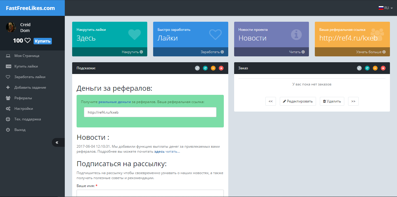 Вот так выглядит главная страница, с которой можно будет перейти в абсолютно любой раздел сервиса. Заработать лайки, накрутить их, купить и так далее – всё это понятно и уже знакомо по пользованию другими сервисами.