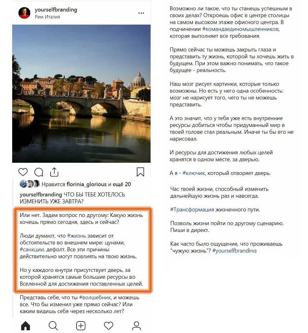 В идеале когда текст решает какую-то узкую проблему подписчика вашего аккаунта в Инстаграме. Но для этого нужно хорошо знать свою целевую аудиторию и все проблемы, которые можно решить благодаря вашим услугам.