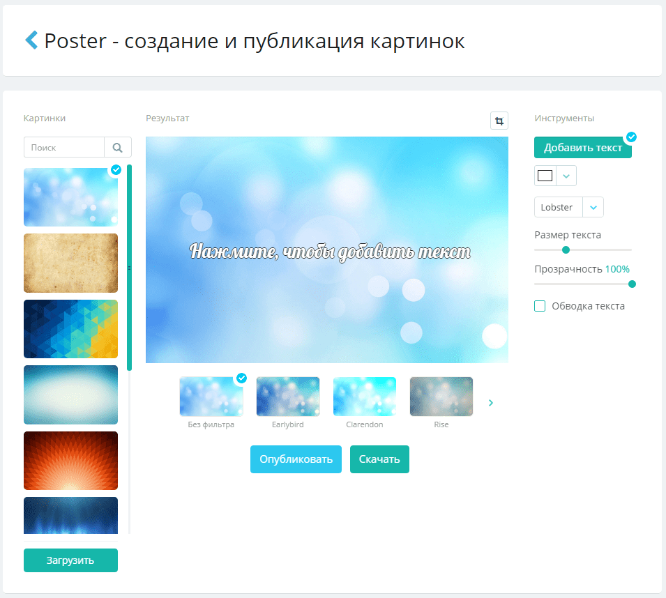 - Постер. Позволяет делать картинки с надписями. Их можно как просто сохранить на сервисе, так и сразу опубликовать.