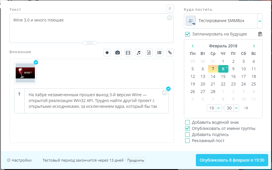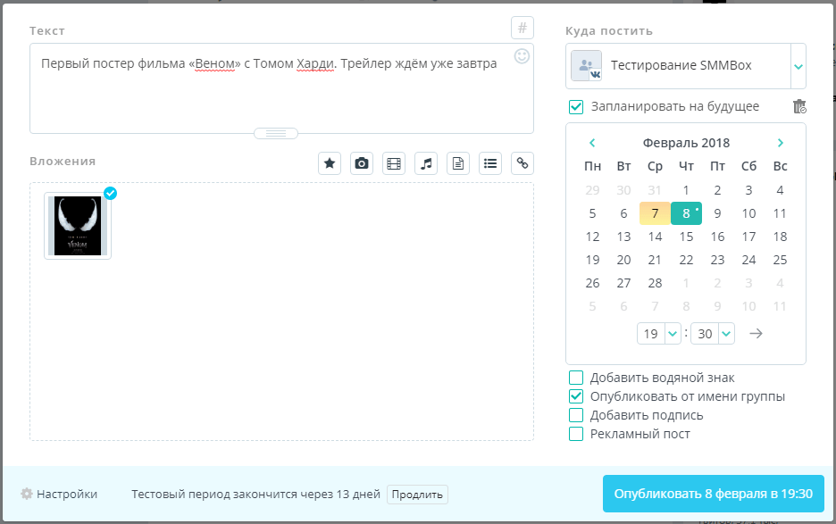 - Создание постов. Добавляем текст и вложения в виде картинок, фотографий, видеозаписей или какого-то документа. Задаем необходимое время для публикации и выбираем социальную сеть, нужную группу. Когда придет время, запись автоматически опубликуется;
