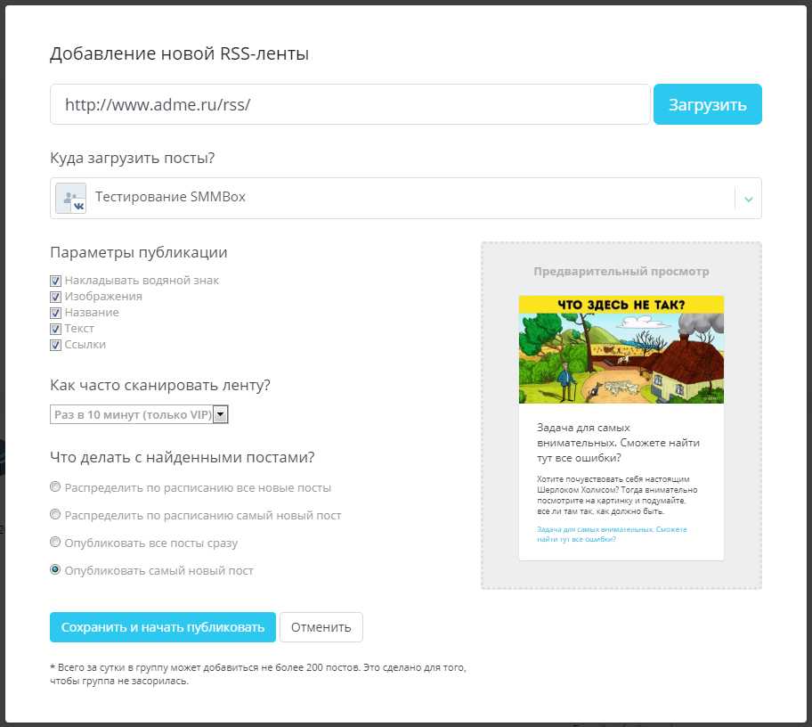 Подключайте любые RSS-каналы и транслируйте их содержимое у себя в группе. Достаточно указать URL канала, группу для постинга и установить необходимые настройки: