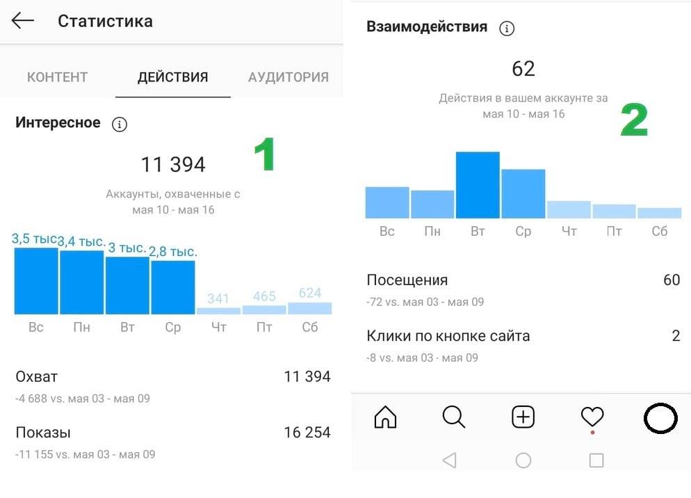 Вторая метрика, «Взаимодействия», расскажет о конверсии аккаунта. Здесь есть 2 показателя: