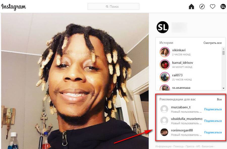 На главной странице Инстаграм при прокрутке ленты справа высвечиваются рекомендованные аккаунты.