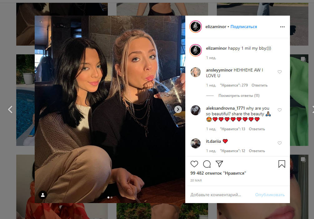 Элиза Минор очень любит публиковать фотографии со своей сестрой в разных местах, даже в автомобиле. Она также посвятила отдельный блок историй для Анслей и коллег, с которыми снимает видеоролики в ТикТок.