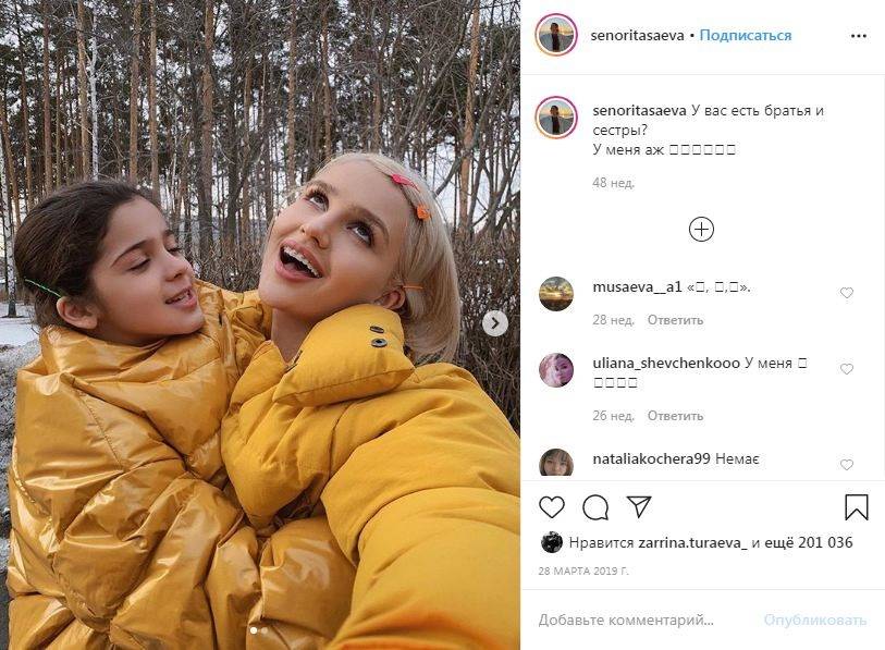 - Инстаграм. На Инстаграм Дины подписано более 5,5 млн. пользователей. Сюда она выкладывает одиночные снимки, фотографии с 9-летней сестренкой, которую зовут Малика, и с друзьями. Саева следит за Мимимишкой, Евой Миллер, Аней Покров и за др. Ссылка на официальную страницу: https://www.instagram.com/senoritasaeva/