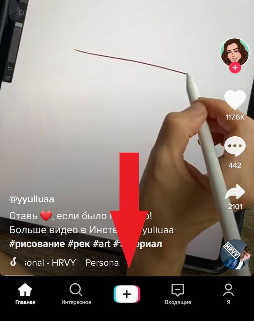 - Войдите в редактор видео, нажав на большой «+» снизу, в середине экрана.