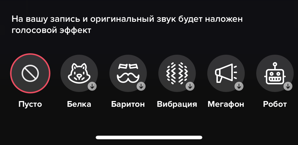 Меняется голос с помощью заранее подготовленных звуковых пресетов, накладываемых поверх оригинальной аудиодорожки. И выбор уже впечатляет: кроме «Эхо», появившегося почти сразу, открылся доступ к «Инопланетянину», «Синтезатору» со странным и слегка искаженным звучанием, и даже «Вибрации», добавляющей «дрожащий» эффект. В качестве эксперимента разработчики TikTok предлагают активировать «Белку» (схожим образом общаются персонажи из мультфильма «Элвин и бурундуки»), «Баритон», «Робот» или «Мегафон», если необходимо донести важную мысль всеми возможными способами.