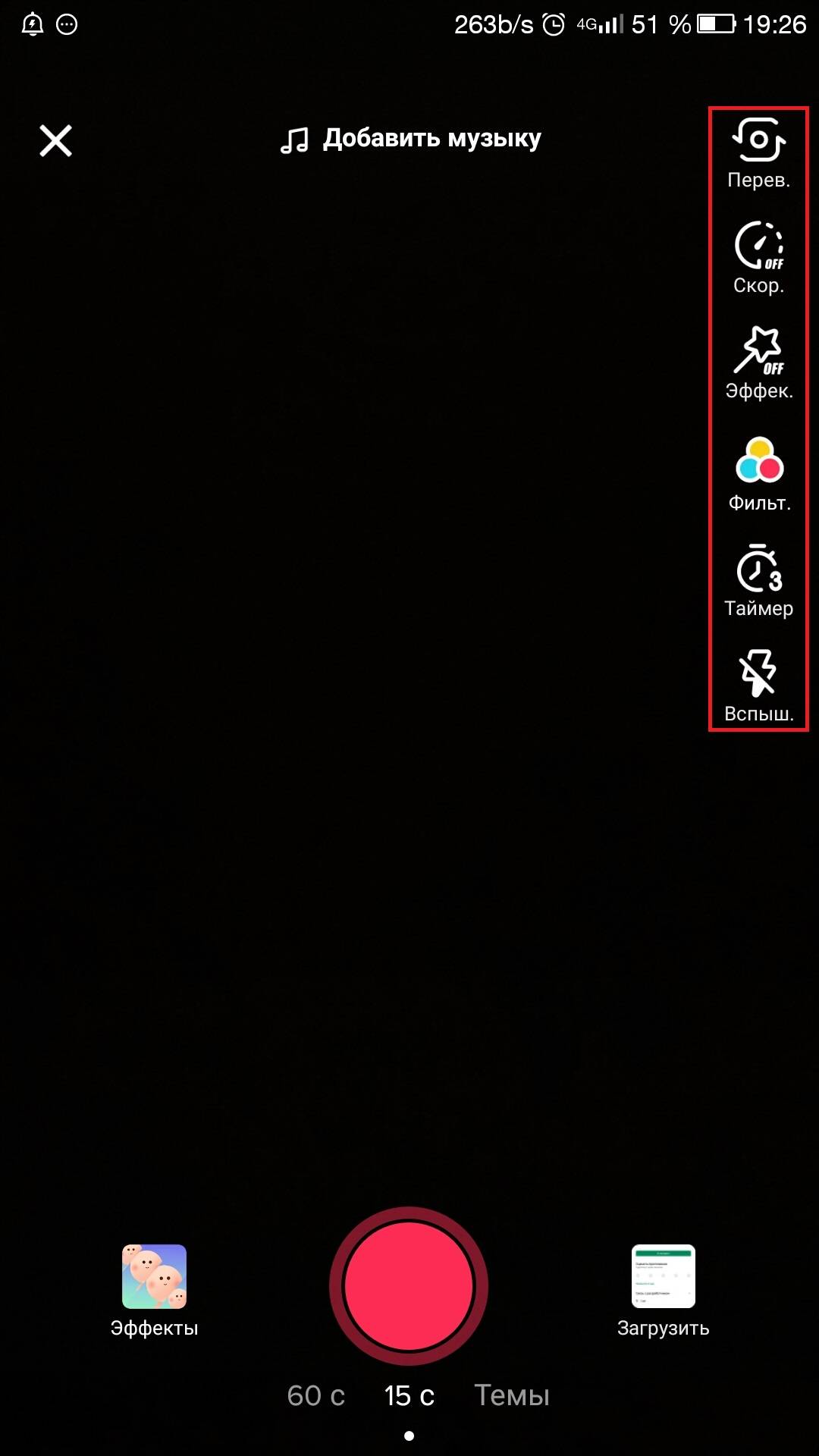 Рекомендуем остановиться свой выбор на длительности видео в 15 секунд, так как Тик-Ток, соцсеть, где очень высокая конкуренция за внимание пользователя. Также можно загрузить видео из галереи