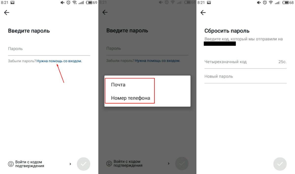 Если пароль был утерян или забыт, для восстановления доступа с телефона Android или Iphone выполняют такие действия: