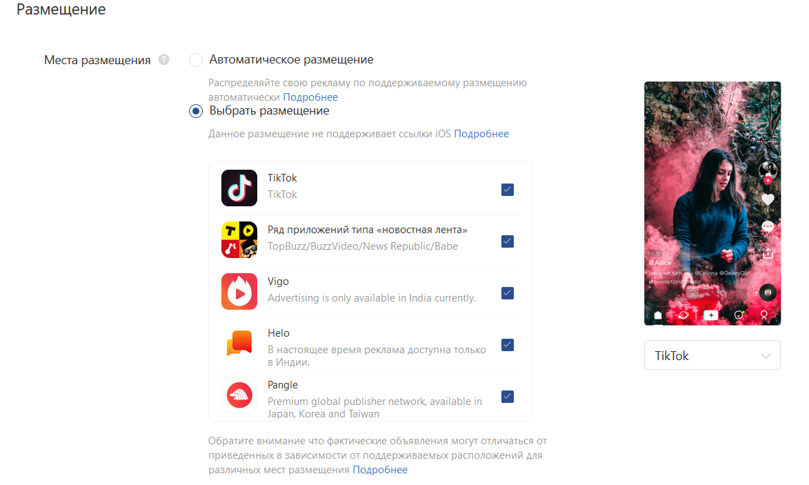 Настройте места размещения. Вы можете разместить таргетированную рекламу не только непосредственно в TikTok, но также в Vigo Video, BuzzVideo, Helo и Pangle