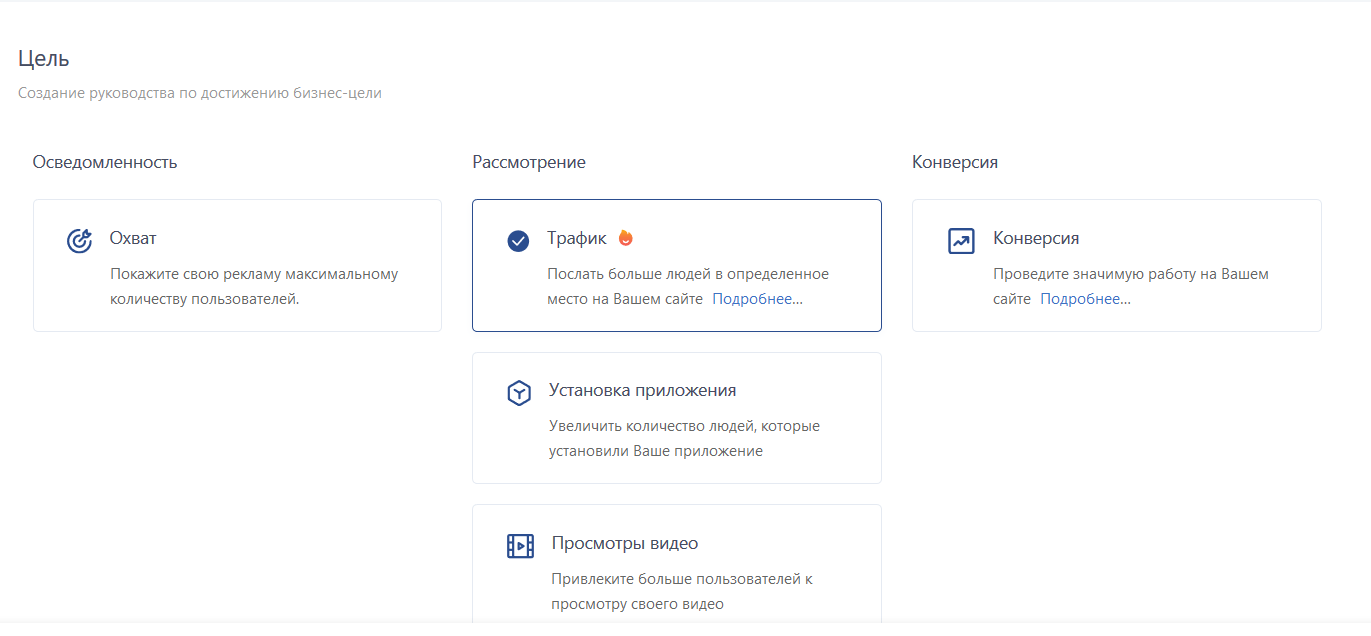 Выберите цель вашей кампании. Доступны цели Осведомленность Рассмотрение, Конверсии. В будущем список наверняка будет дополняться.