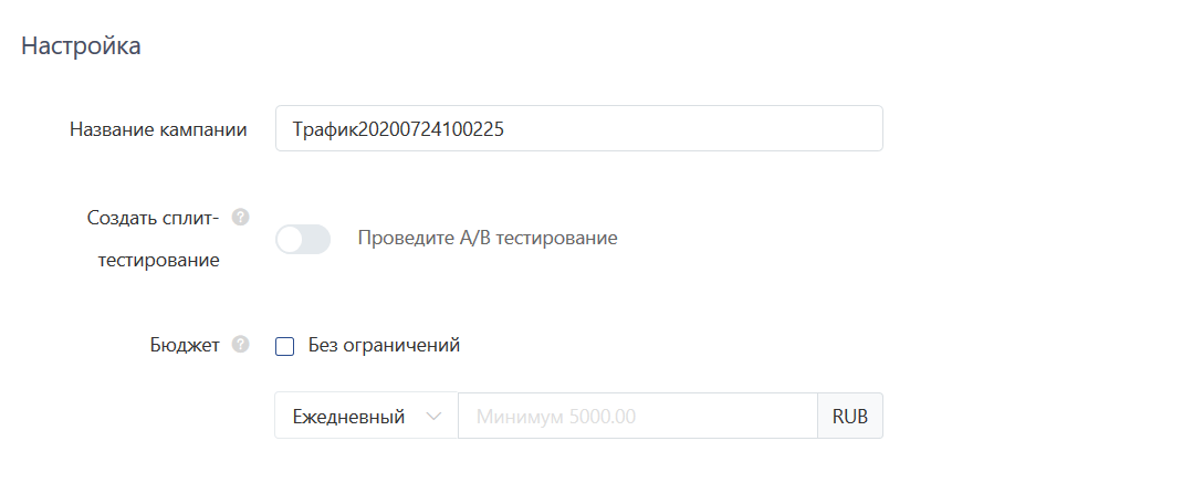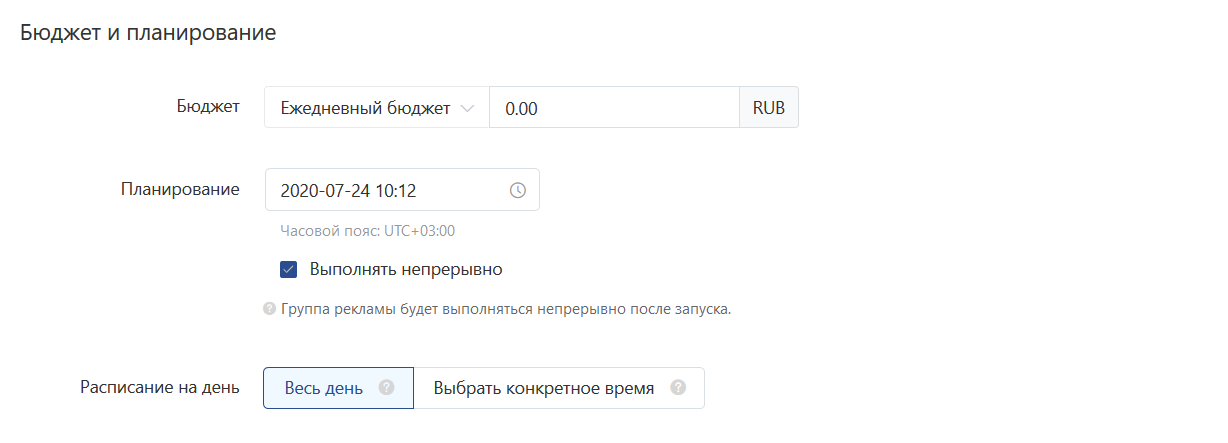 Установите бюджет кампании. Можно выбрать Дневной (суточный) бюджет или Общий бюджет. В будущем вы сможете изменить бюджет в настройках рекламной кампании.