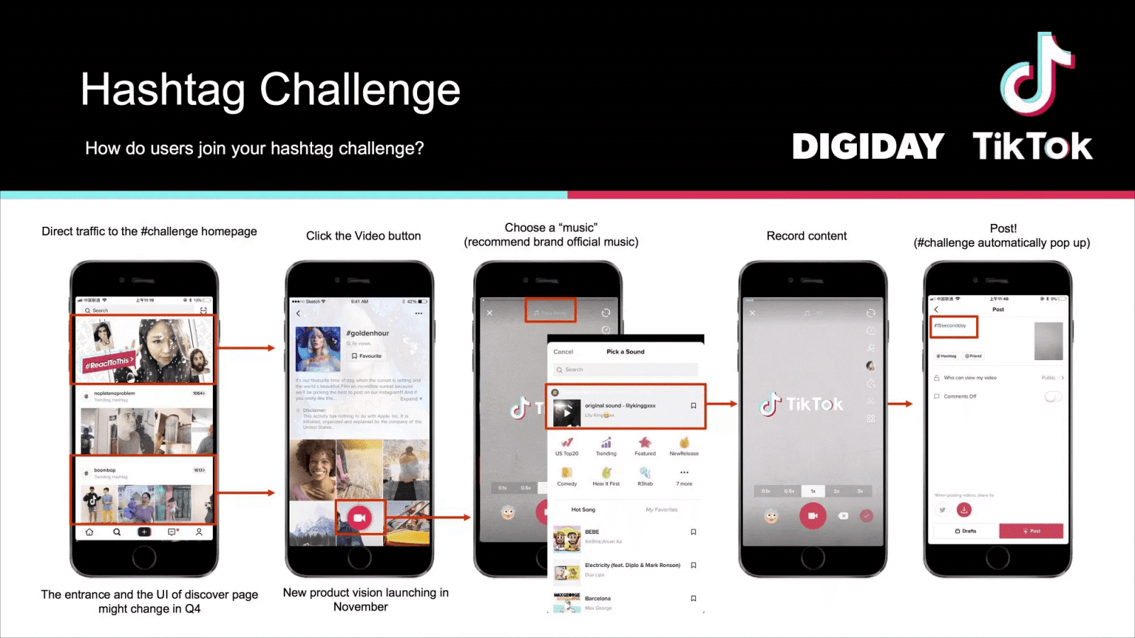 - Hashtag Challenge. Баннер, появляющийся в разделе поиска. Анонсирует свежие активности. Этим форматом пользуются популярные тиктокеры, интегрируя в свое видео брендированный хештег и музыкальный джингл. Так о челлендже узнают остальные пользователи. Стоимость запуска челленджа – 60 000$. Вот как Hashtag Challenge выглядит для зрителя: