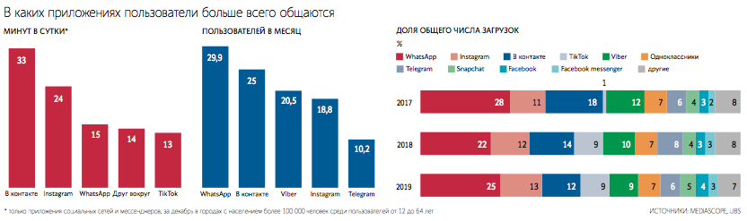 В среднем пользователь проводит в ТикТок 13 минут в сутки, говорит исследование Mediascope. Среди мессенджеров и социальных сетей приложение заняло 4 позицию, TikTok опережают только ВКонтакте, Instagram, WhatsApp.