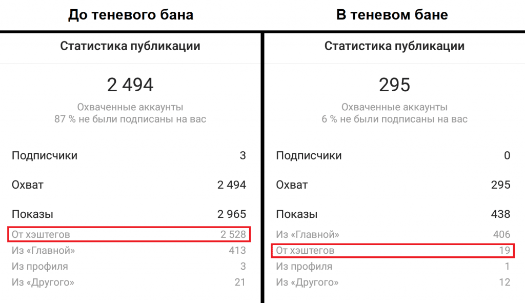 Данный алгоритм доступен для бизнес аккаунтов. В аналитике подробно рассказывается, сколько просмотрен пост, сколько новых подписчиков заработал и пр. Если пользователя поместили в теневую блокировку, то общий показатель останется минимальным.